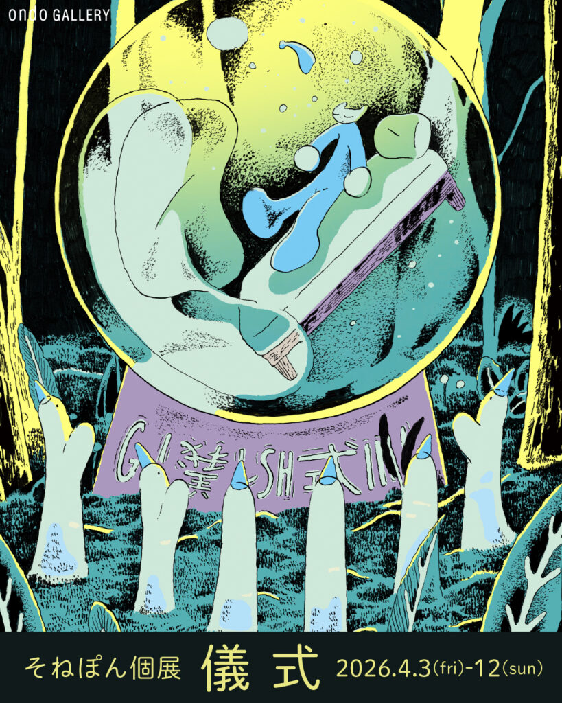 繊細なタッチで描かれた幻想的な木々の中に佇むふたり。心象風景のようでありながらどこか懐かしい印象も感じられ、その独自の美しさに心揺さぶられます。物語を感じる余白のある表現から想像力を掻き立てられ、眺めているうちに作品世界へと誘われます。そねぽん個展『儀式』展示作品。