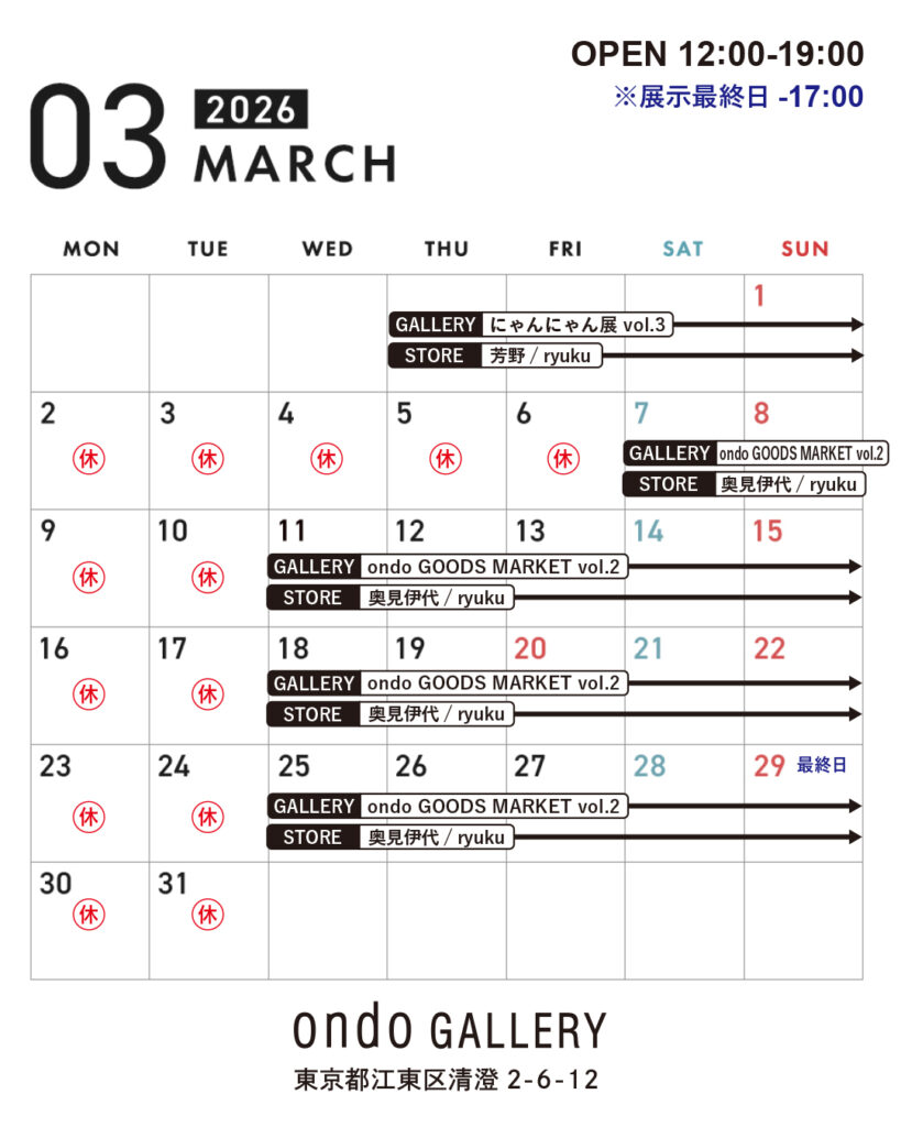 NEWS-お知らせ- ギャラリー(東京・清澄白河)営業日について 2025.10.01 【ondo gallery(東京・清澄白河)スケジュール】 【営業日】 ギャラリー営業日は展示開催スケジュールに準じます。 展示が開催されてない日はクローズしておりますので、お気をつけください。 【営業時間】 通常 12:00-19:00(展示最終日のみ12:00-17:00)